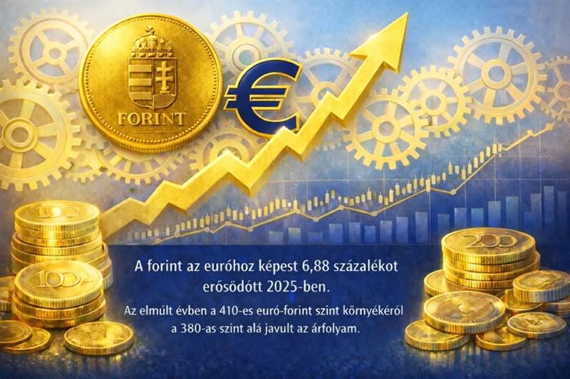 A forint árfolyama az euróhoz képest az elmúlt évben a 410-es szint környékéről a 380-as szint alá javult.