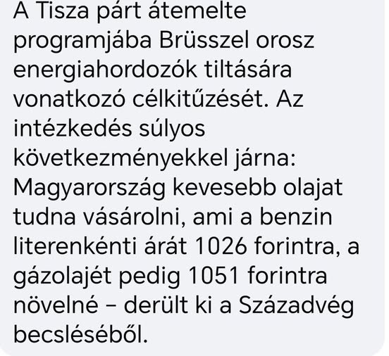 ️A Tisza Párt átemelte programjába Brüsszel orosz energiahordozók tiltására vonatkozó célkitűzését. Az intézkedés súlyos következményekkel járna: Magyarország kevesebb olajat tudna vásárolni, ami a…