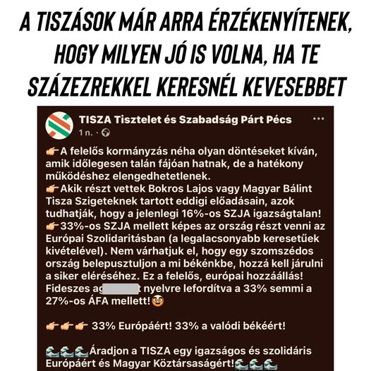 A Tiszások folyamatosan a 27 százalékos áfa miatt sírnak, a 33 százalékos jövedelemadót kisebbnek látják mint a 9 százalékosat...