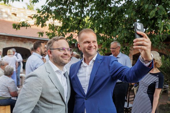 Baráti beszélgetés a jövőbeli együttműködésekről, egy különleges helyszínen.
