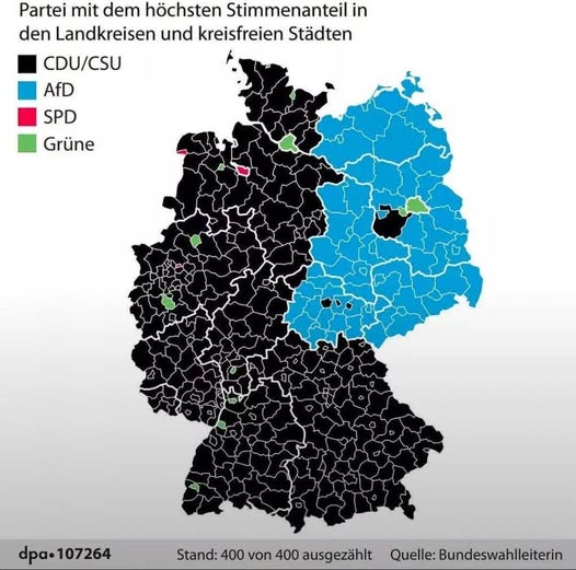 A német választások várható eredménye: a győztes párt járásonként. A kereszténydemokraták hozzák az NSZK-t, az AfD az NDK-t és Hamburgot, a zöldek pár nagyvárost.