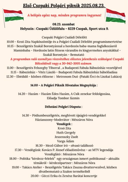 A Csopaki Polgári Kör Kulturális Egyesület 2025. augusztus 23-án 10.00 és 21.00 óra között tartja első polgári piknikjét.