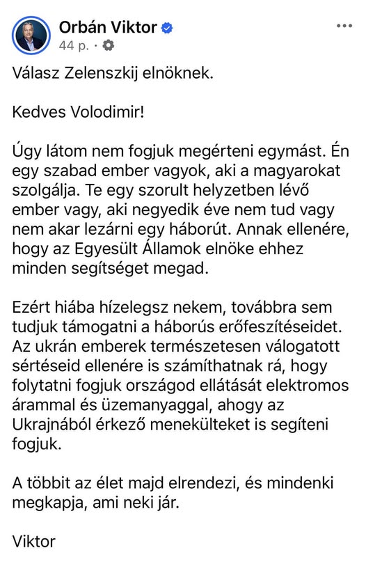 Orbán Viktor válasza a fenyegetőző Zelenszkijnek