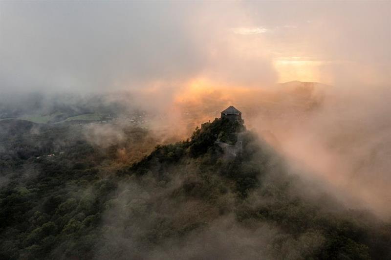 A drónnal készült felvételen a felhővel körülvett salgói vár Salgótarján közelében.