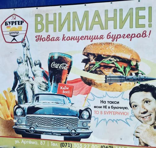 "Figyelem! Új koncepciós haburger!" Reklámplakát a Donbasszban