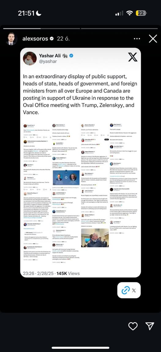 Alex Soros büszke a kesztyűbábjaira, amiért ennyi év után már reflexből állnak be a háború mellé a békével szemben. Na, kérem, ezért tart itt Európa!