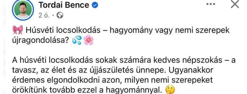 Tordai (Villa) Bence szerint nem csak a férfiaknak kellene locsolkodniuk, “ideje átgondolni, hogy milyen nemi szerepeket örökítünk tovább.”