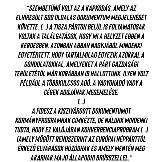 3. VALÓDI A KISZIVÁRGOTT MEGSZORÍTÓCSOMAG: „Létezik egy kifelé kommunikált, kampányszerű program, de a valós szándékok ettől túl sok esetben eltérnek” – fogalmazott, majd elmondta: szembetűnő volt szerinte az a kapkodás, amely a 600 oldalas tiszás megszorítócsomag megjelenését követte. Párton belül mindenki egyetértett, hogy tartalmilag egyezik azzal, amit már korábban is hallottak. A programot párton belül „konvergenciaprogramnak” nevezték, emellett a nyilvánosság számára készül egy választási gazdasági program is, kifelé csak ezt kommunikálják.