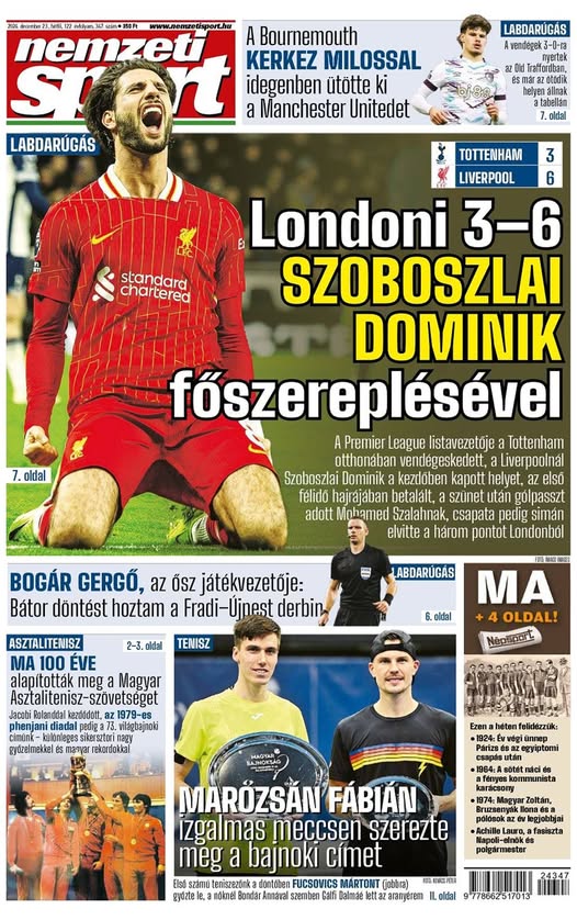 Londoni 3–6 Szoboszlai Dominik főszereplésével; A magyar asztalitenisz első 100 évének sikersztorija – mai lapunkból ajánljuk