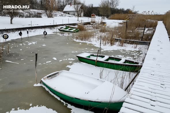 Téli arcát mutatja a Velencei-tó, havazás után a pákozdi hajóállomásnál.