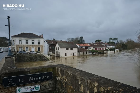 A Midouze folyó vízszintje rendkívüli mértékben megemelkedett a délnyugat-franciaországi Tartas térségében, és az áradó víz elöntötte az alacsonyan fekvő utcákat és mezőgazdasági területeket.