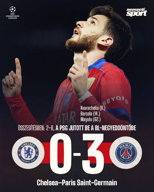 Ez megint nagyon sima volt: 8–2-es összesítéssel kiütötte a Chelsea-t, és bejutott a Bajnokok Ligája negyeddöntőjébe a Paris Saint-Germain! 💪🏆
