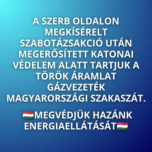 Tegnap a Magyarországot ellátó Török Áramlat gázvezetéket fel akarták robbantani. A Védelmi Tanács ülésén elrendeltük a vezeték katonai védelmét.
