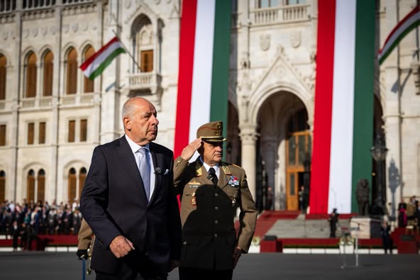 Az Országház előtt, katonai tiszteletadással felvonták a nemzeti lobogót.