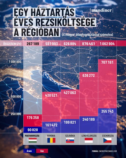 Mind az áram, mind pedig gáz terén a magyar családoknak kell a legkevesebbet fizetniük az Európai Unióban. 🙏 Térképre tettük Európa rezsiszámláit: https://mandiner.hu/gazdasag/2025/03/terkepre-tettuk…