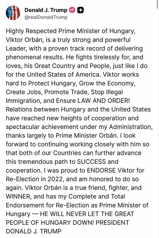 Trump arról írt, hogy Orbánt támogatja a választáson, és soha nem fogja cserben hagyni Magyarország nagyszerű népét. Nem is rossz