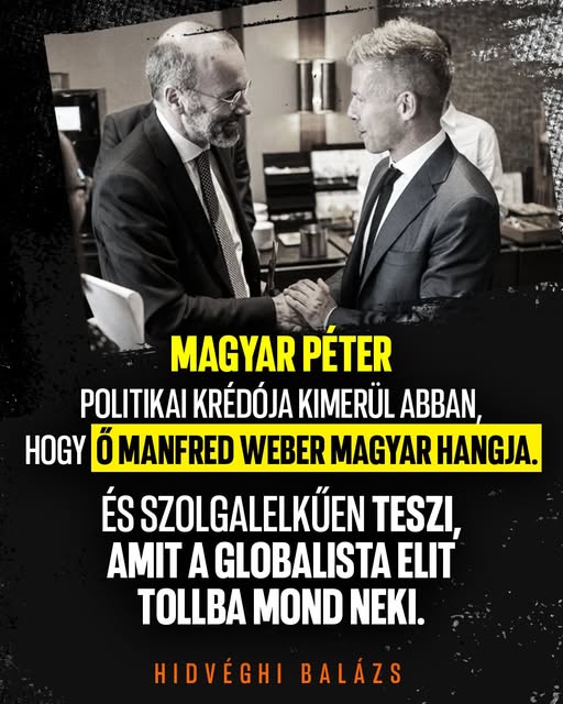 Magyar Péter politikai krédója kimerül abban, hogy ő Manfred Weber magyar hangja, szolgalelkűen teszi, amit a globalista mainstream tollba mond neki.