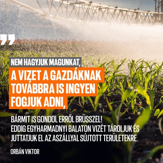 Brüsszel persze megtámadta a magyar kormányt, amiért ingyen adja a vizet a magyar gazdáknak. Nem engedünk a nyomásnak, nem hagyjuk magunkat, ezért a vizet a gazdáknak továbbra is ingyen fogjuk adni, bármit is gondol erről Brüsszel.
