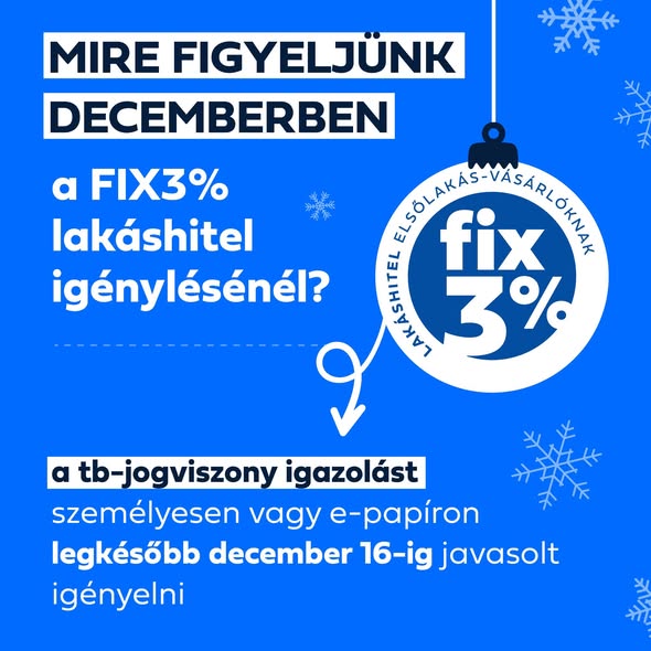 Közelegnek az év végi ünnepek. Az év végi leállás a földhivatalokat és az egészségbiztosítási ügyfélszolgálatokat is érinti, erre a FIX 3 százalékos lakáshitel iránt érdeklődőknek érdemes figyelni.