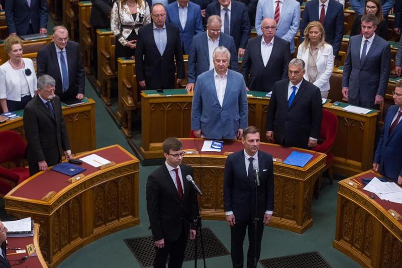 Két új miniszter tett esküt a Parlamentben: Tuzson Bence és Bóka János. Novák Katalin köztársasági elnök a 4 év után leköszönő Varga Juditminiszternek is köszönetet mondott. A teremben 5 ellenzéki/…