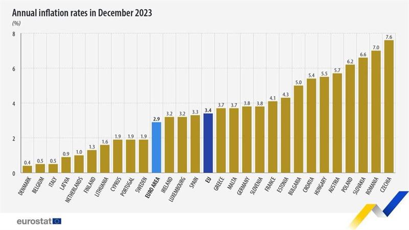 Az EU tagállamai közül 2023 decemberében a legmagasabb éves inflációs ráták: