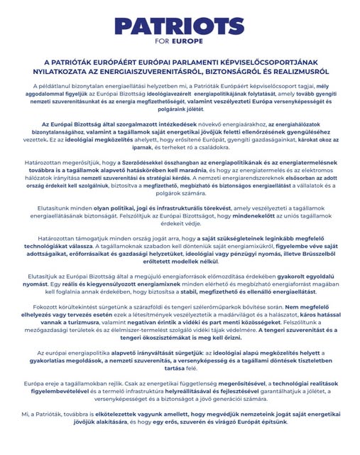 A Patrióta-frakció kihelyezett ülésén nyilatkozatot fogadtunk el az energiabiztonságról- és szuverenitásról.