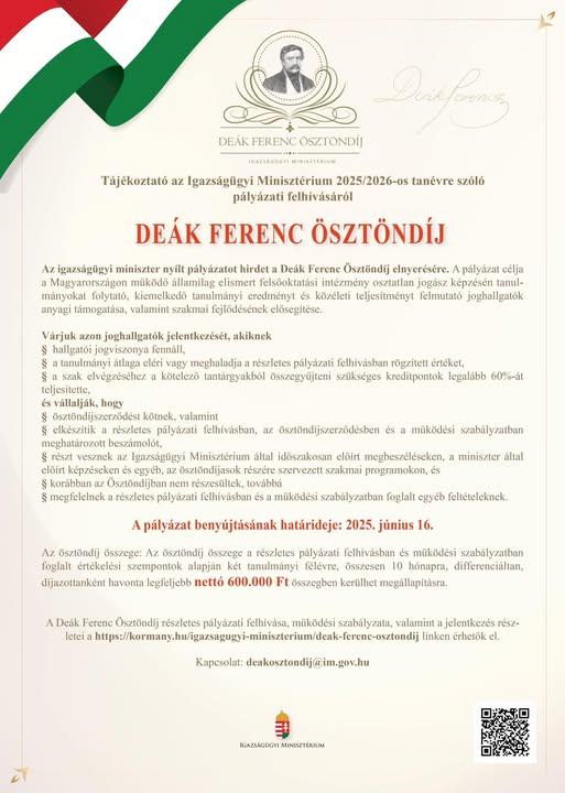 Az Igazságügyi Minisztérium a 2025/2026-os tanévre ismét nyílt pályázatot hirdet a Deák Ferenc Ösztöndíj elnyerésére.