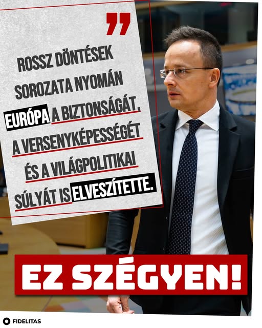 Rossz döntések sorozata nyomán Európa a biztonságát, a versenyképességét és a világpolitikai súlyát is elveszítette. Ez szégyen! - Szijjártó Péter