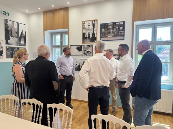 Sajtótájékoztató Dunaújvárosban, a felújított Mondbach-kúria előtt, ahová a kormányzati támogatásból jelenleg restaurálás alatt álló Szentháromság-szobor kerül majd.