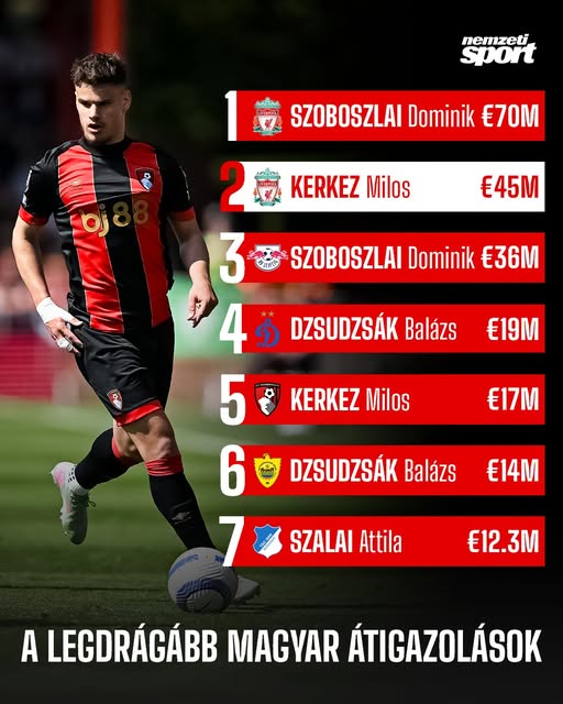 Szoboszlai Dominik mögött eddig Dzsudzsák Balázs állt a rangsorban 19 millió euróval. 👇🇭