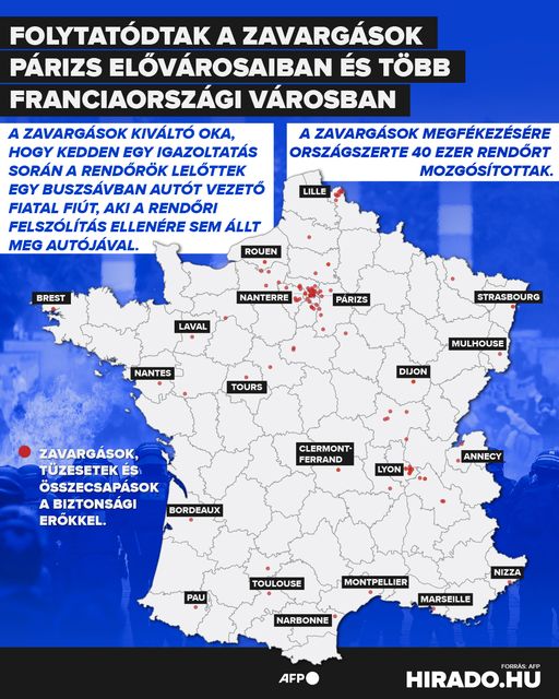 A párizsi régióban csütörtök este óta nincs autóbusz- és villamosforgalom, a francia főváros központjától nyolc kilométerre fekvő Clamart-ban éjszakai kijárási tilalmat rendeltek el. A zavargások megfékezésére országszerte 40 ezer rendőrt mozgósítottak. Macron elnök péntek délutánra újabb rendkívüli ülést hívott össze.