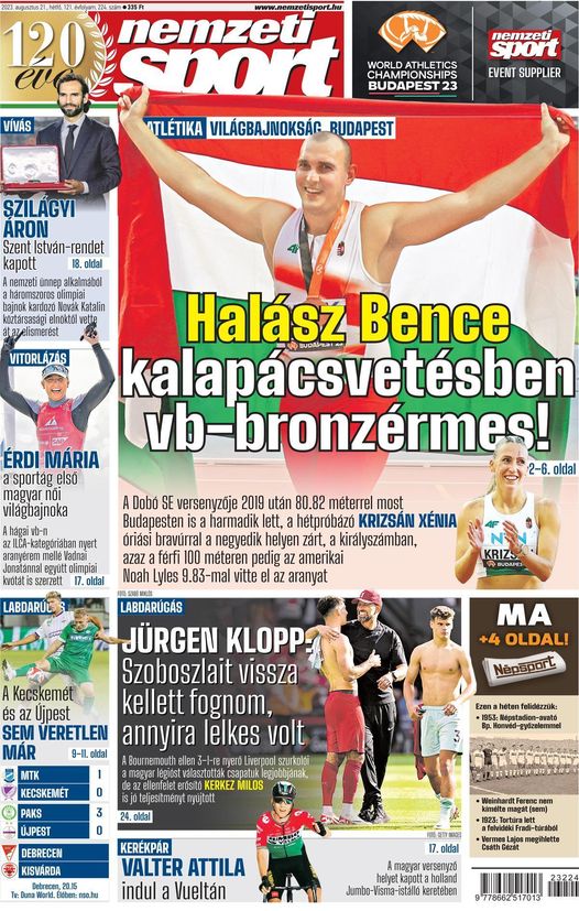 Halász Bence kalapácsvetésben vb-bronzérmes!; Szoboszlai Dominik Liverpoolt is meghódíthatja