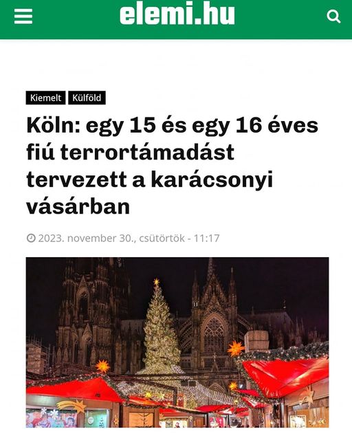 Egy 15 és egy 16 éves akart terrortámadást a kölni karácsonyi vásárban. Valószínűleg egy "mérnök és egy gyermekorvos". Bővebben: https://www.elemi.hu/koln-egy-15-es-egy-16-eves-fiu-terrortamadast-…