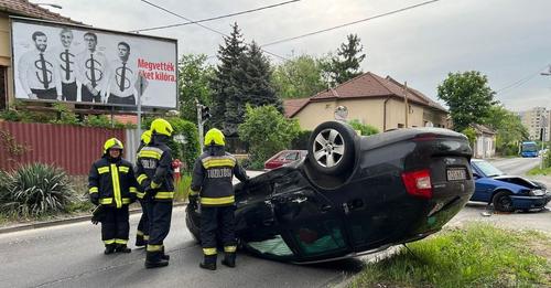 Az egyik autó felborult az ütközés erejétől.
