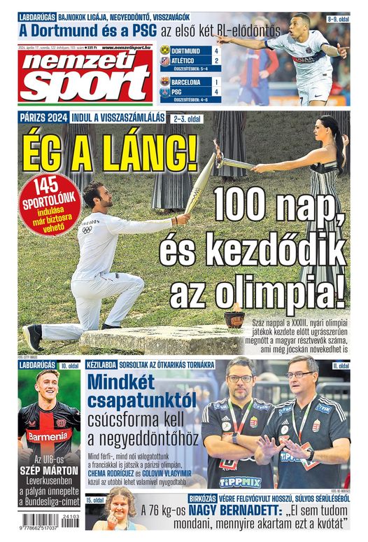 Ég a láng, és 100 nap múlva rajtol az olimpia!; Dortmund, PSG: BL-elődöntő! – a Nemzeti Sport szerdai számából ajánljuk: https://buff.ly/4aZ9KlU