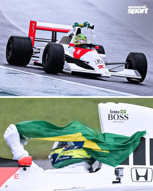 Lewis Hamilton a brazil zászlót lengetve vezette a legendás F1-es pilóta, Ayrton Senna 1990-es vb-győztes versenyautóját az interlagosi pályán. 🙏