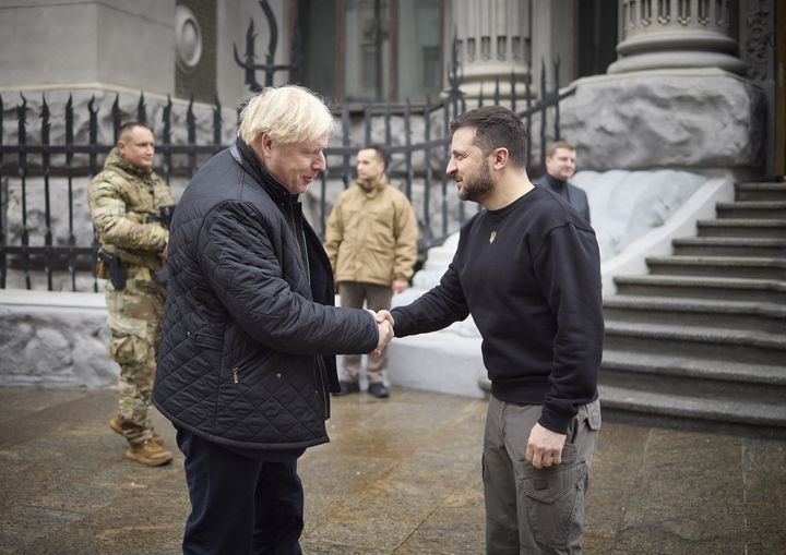 Az ukrán elnöki sajtószolgálat által közreadott képen Volodimir Zelenszkij ukrán elnök (j) fogadja Boris Johnson volt brit miniszterelnököt (b, elöl) Kijevben 2023. január 22-én. (MTI/EPA/Ukrán…