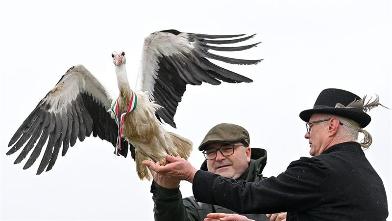 Sérüléséből meggyógyult, könnyen leváló nemzeti színű szalaggal megjelölt gólyát enged szabadon Medgyesi Gergely Árpád, a Hortobágyi Nemzeti Park igazgatója (b) és Déri János igazgató-állatorvos a…