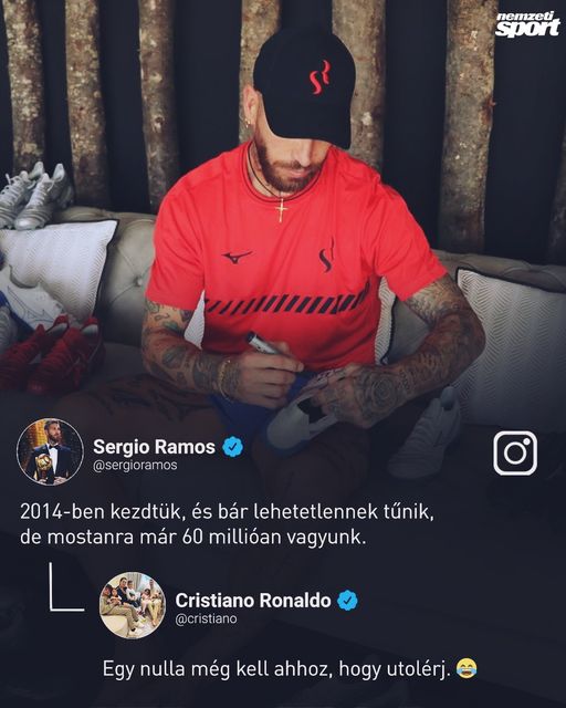 Cristiano Ronaldo kommentben szúrt oda Sergio Ramosnak, aki elérte a 6⃣0⃣ millió követőt az Instagramon.