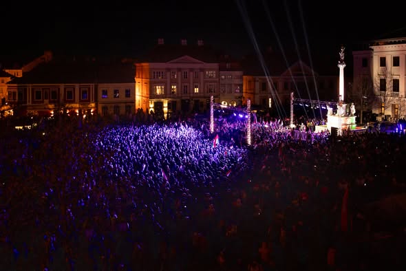 Teltház fogadta a Széchenyi téren Orbán Viktor kormányfőt országjárása győri állomásán.