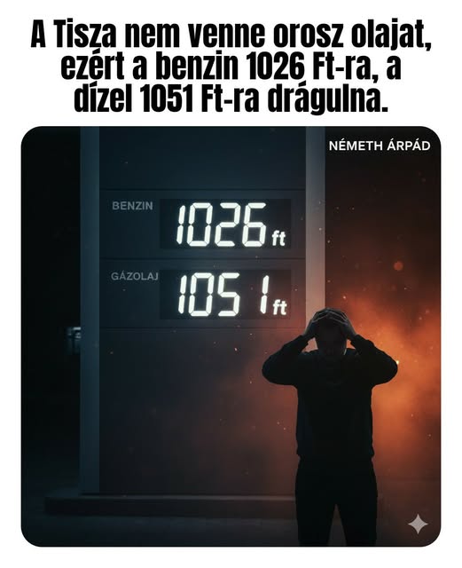 A Tisza Ursuláék parancsára nem venne orosz olajat, ezért a benzin 1026 Ft-ra, a dízel 1051 Ft-ra drágulna. Csak az szavaz rájuk, aki önmaga és a családja ellensége.