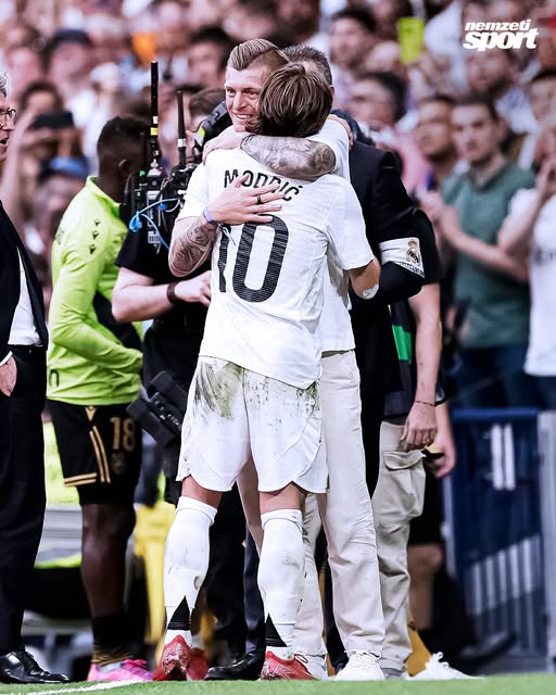 Csodálatos pillanat: Luka Modrićot az utolsó Real Madrid-mérkőzésén a lecserélése után korábbi csapattársa és barátja, Toni Kroos várta a partvonal mellett.