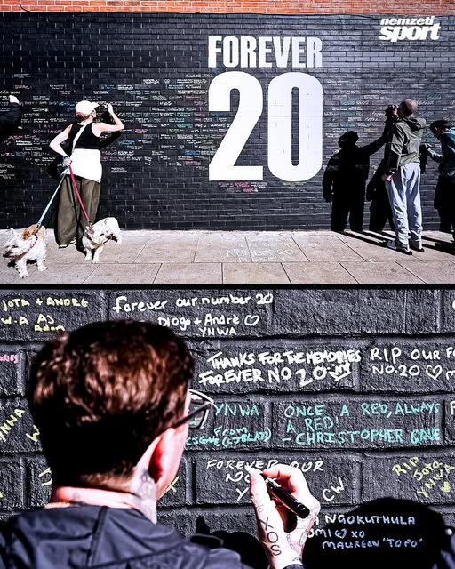 Liverpoolban az Anfield közvetlen közelében egy feketére festett tűzfalon üzennek a szurkolók a klub nemrég elhunyt játékosának, Diogo Jotának.