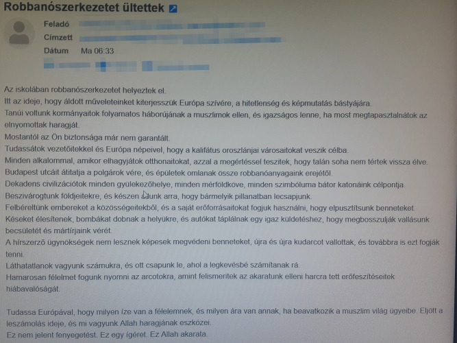 Ezt a levelet kapták a bombafenyegetéssel érintett iskolák.