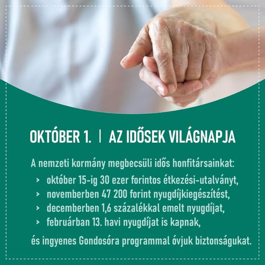 Idős honfitársaink áldozatos életútja mindannyiunk számára tiszteletet és megbecsülést jelent. A Fidesz-KDNP ezért 15 esztendővel ezelőtt ígéretet tett arra, hogy megóvja a nyugdíjasok életminőségét. Ez idő alatt sikerült megvédeni, sőt emelni a nyugdíjak reálértékét és visszaadni a baloldal által elvett 13. havi nyugdíjat. Novemberben átlagosan 47.200 forint visszamenőleg biztosított inflációkövető emelés érkezik majd a nyugdíjjal együtt, ezt követően pedig már a magasabb összeget kapják havonta az érintettek. A kormány családközpontú politikájának az élelmiszer-, valamint a rezsiár megfékezését célzó intézkedései kiemelt jelentőséggel bírnak az idős emberek életében. Időről időre pedig további, eseti támogatások is segítik őket. Az idei esztendőben 30 ezer forint értékű élelmiszer-utalványokat kapnak a nyugdíjasok, melyek kézbesítése már zajlik.
