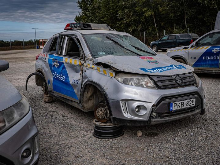 Békés menekültek találkozása rendőrautóval. 2023, déli határ, ismeretlen szerző
