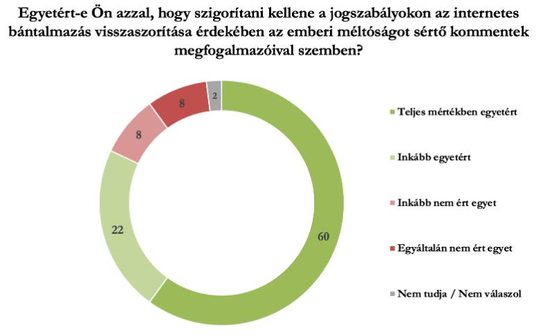Arra a kérdésre, hogy “Egyetért-e Ön azzal, hogy szigorítani kellene a jogszabályokon az internetes bántalmazás visszaszorítása érdekében, illetve az emberi méltóságot sértő kommentek…