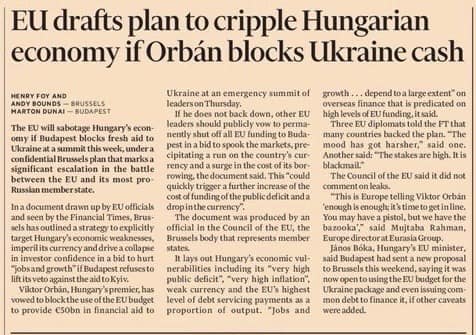 Brüsszel a Financial Times címlapján fenyegette meg Magyarországot azzal, hogy ha nem adunk pénzt hitelből Ukrajnának, akkor majd ők sem adnak nekünk forrásokat!