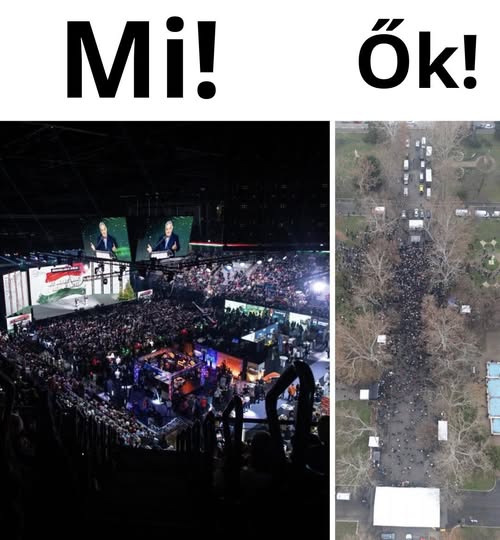 ☝️Egyik fotón 8000 ember áll ki Orbán Viktor és a béke mellett valamint a megszorítások ellen, a másik oldalon meg az a pár száz lézengő aki még hisz Magyar Péter hazugságainak