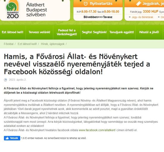 Hamis nyereményjátékot hirdetnek csalók a Facebookon a Fővárosi Állat- és Növénykert nevében – adta hírül az intézmény honlapja.